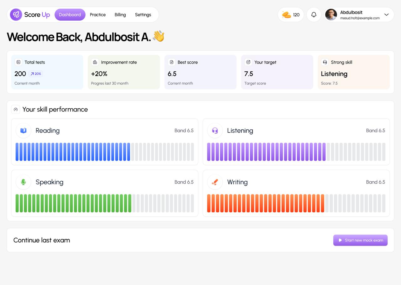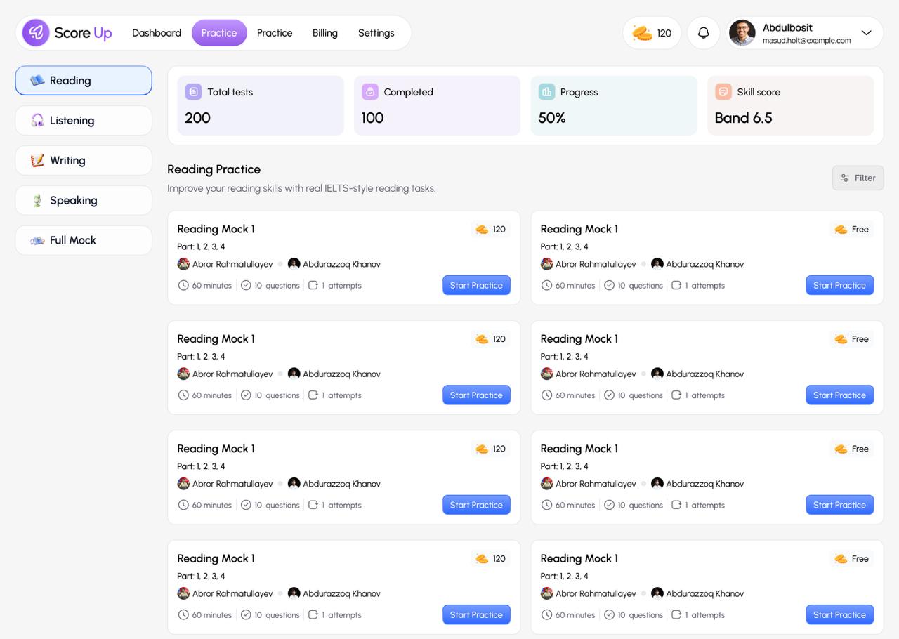 Score up website boyicha fikrlarim ijobiy tushunishga oson, sodda qilib ishlangan bita taklifim mock qilib bolganda keyin natijaga qarab tangalar yigʻish funksiyasini ham qoʻshish kerak